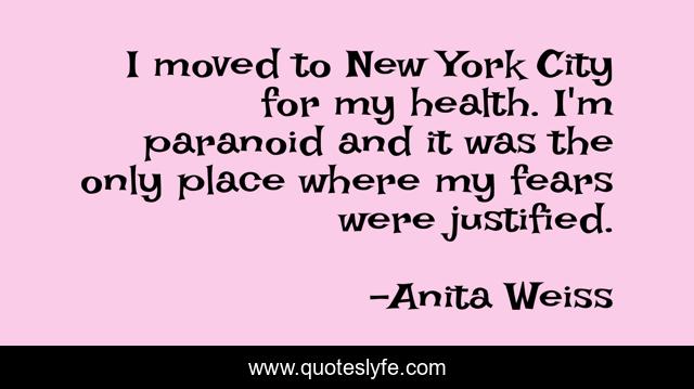 This page presents the quote "I moved to New York City for my health. I'm paranoid and it was the only place where my fears were justified.". Author of this quote is Anita Weiss. .