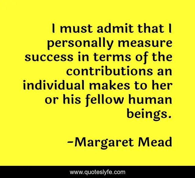 This page presents the quote "I must admit that I personally measure success in terms of the contributions an individual makes to her or his fellow human beings.". Author of this quote is Margaret Mead. This quote is about her, human, measure,.