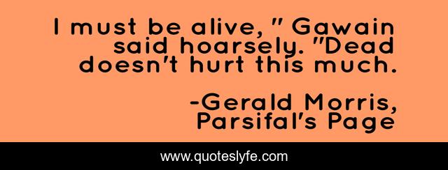 This page presents the quote "I must be alive, " Gawain said hoarsely. "Dead doesn't hurt this much.". Author of this quote is Gerald Morris, Parsifal's Page. This quote is about funny, pain, bed, gawain, dead, parsifal, comedy, alive,.