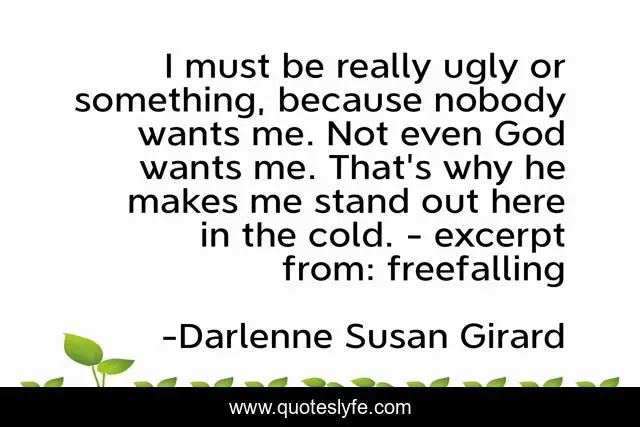 This page presents the quote "I must be really ugly or something, because nobody wants me. Not even God wants me. That's why he makes me stand out here in the cold. - excerpt from: freefalling". Author of this quote is Darlenne Susan Girard. This quote is about drama, young-adult,.