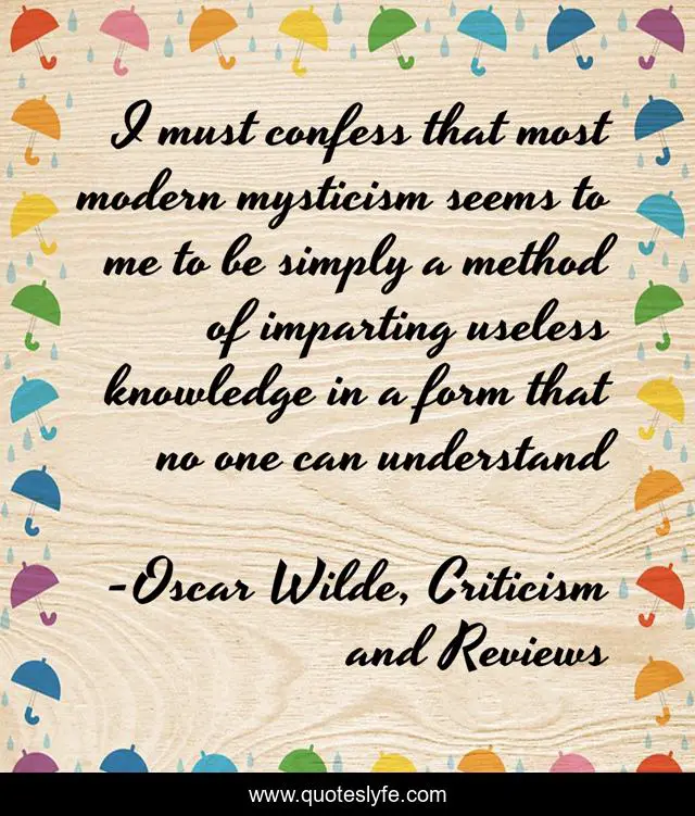 This page presents the quote "I must confess that most modern mysticism seems to me to be simply a method of imparting useless knowledge in a form that no one can understand". Author of this quote is Oscar Wilde, Criticism and Reviews. This quote is about mysticism, humor,.