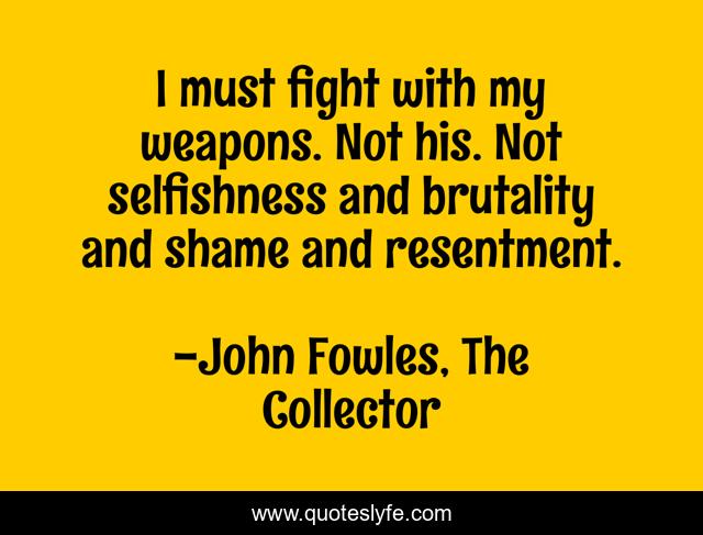 This page presents the quote "I must fight with my weapons. Not his. Not selfishness and brutality and shame and resentment.". Author of this quote is John Fowles, The Collector. This quote is about john, brutality, resentment, weapons, shame, fowles, selfishness, fight, collector,.