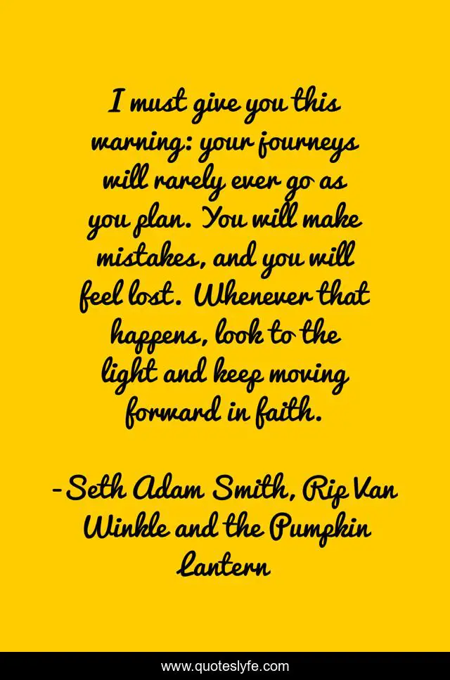 This page presents the quote "I must give you this warning: your journeys will rarely ever go as you plan. You will make mistakes, and you will feel lost. Whenever that happens, look to the light and keep moving forward in faith.". Author of this quote is Seth Adam Smith, Rip Van Winkle and the Pumpkin Lantern. This quote is about faith, moving-forward-in-life, moving-forward, lost, journeys, light, feeling-lost, journey-of-life, mistakes,.