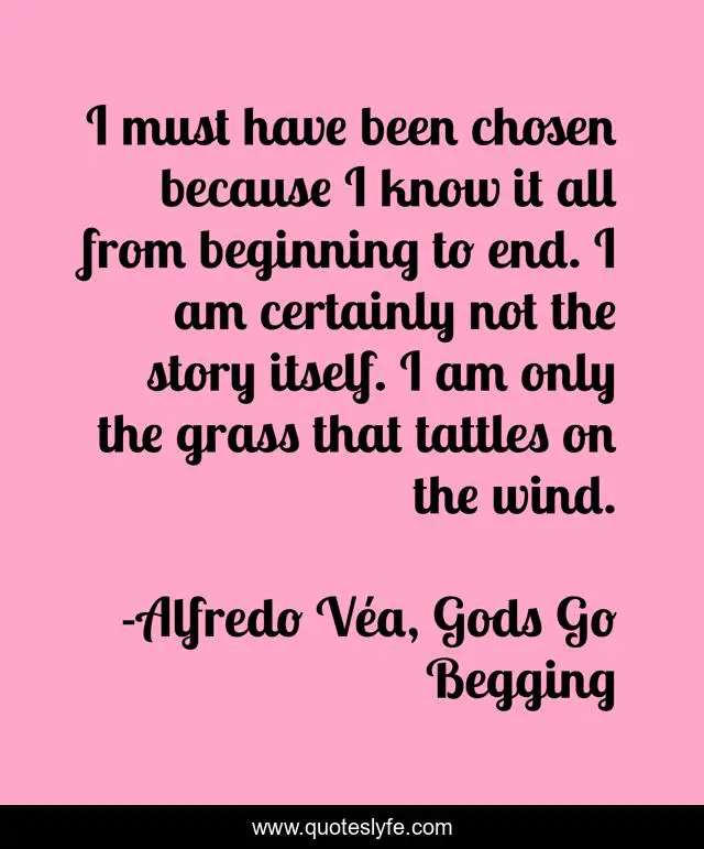 This page presents the quote "I must have been chosen because I know it all from beginning to end. I am certainly not the story itself. I am only the grass that tattles on the wind.". Author of this quote is Alfredo Véa, Gods Go Begging. This quote is about stories, storyteller, storytelling, gods-go-begging,.