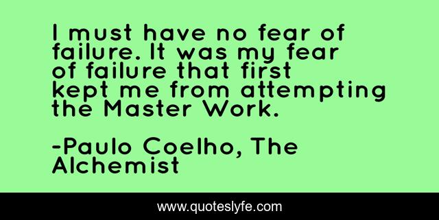 This page presents the quote "I must have no fear of failure. It was my fear of failure that first kept me from attempting the Master Work.". Author of this quote is Paulo Coelho, The Alchemist. This quote is about success, the-alchemist, quote, inspirational, insistence, enthusiasm,.