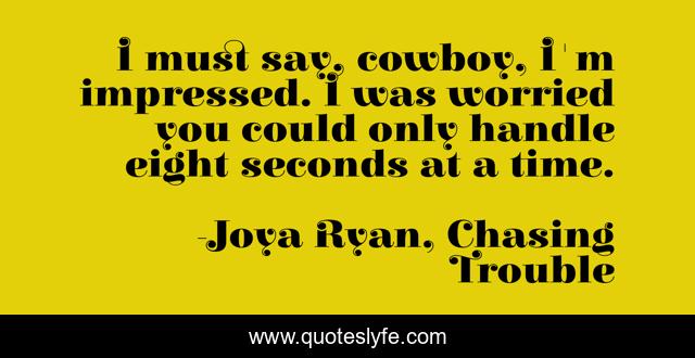 This page presents the quote "I must say, cowboy, I'm impressed. I was worried you could only handle eight seconds at a time.". Author of this quote is Joya Ryan, Chasing Trouble. This quote is about small-town, contemporary-romance, brazen, cowboy,.