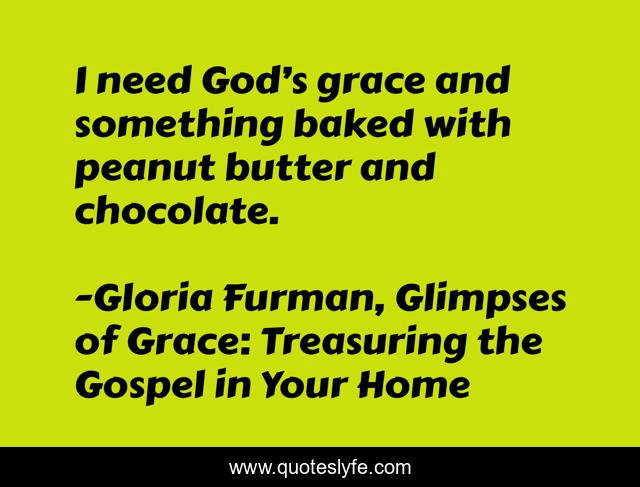 This page presents the quote "I need God’s grace and something baked with peanut butter and chocolate.". Author of this quote is Gloria Furman, Glimpses of Grace: Treasuring the Gospel in Your Home. This quote is about god, grace, loc1769, chocolate,.