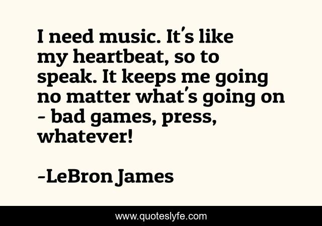 This page presents the quote "I need music. It's like my heartbeat, so to speak. It keeps me going no matter what's going on - bad games, press, whatever!". Author of this quote is LeBron James. This quote is about me, matter, speak,.