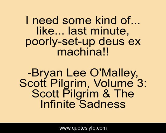 This page presents the quote "I need some kind of... like... last minute, poorly-set-up deus ex machina!!". Author of this quote is Bryan Lee O'Malley, Scott Pilgrim, Volume 3: Scott Pilgrim & The Infinite Sadness. .