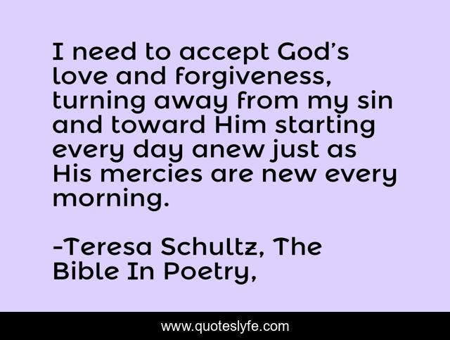 This page presents the quote "I need to accept God’s love and forgiveness, turning away from my sin and toward Him starting every day anew just as His mercies are new every morning.". Author of this quote is Teresa Schultz, The Bible In Poetry,. This quote is about mercy, love, morning, new, forgiveness, sin, affection,.