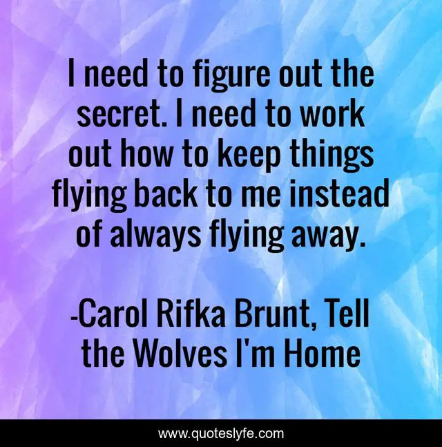 This page presents the quote "I need to figure out the secret. I need to work out how to keep things flying back to me instead of always flying away.". Author of this quote is Carol Rifka Brunt, Tell the Wolves I'm Home. This quote is about relationships, loss, love, lonliness, friendship, affection,.