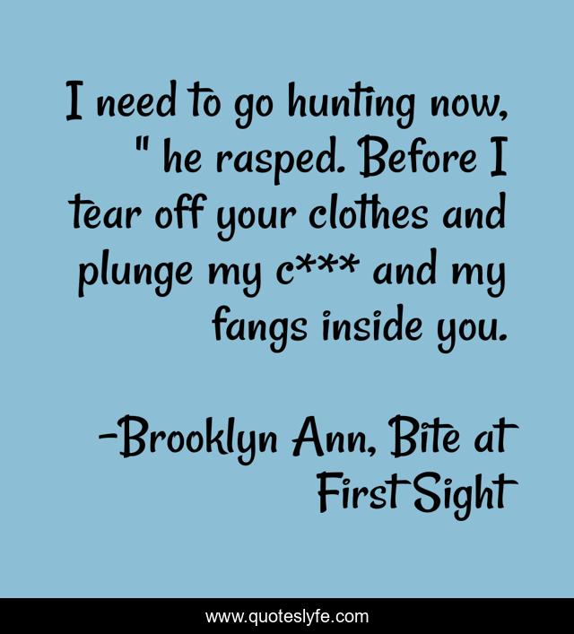 This page presents the quote "I need to go hunting now, " he rasped. Before I tear off your clothes and plunge my c*** and my fangs inside you.". Author of this quote is Brooklyn Ann, Bite at First Sight. This quote is about regency-romance, paranormal-romance, vampire-romance,.