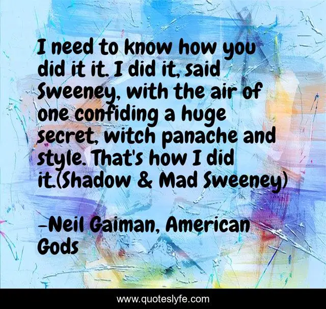 This page presents the quote "I need to know how you did it it. I did it, said Sweeney, with the air of one confiding a huge secret, witch panache and style. That's how I did it.(Shadow & Mad Sweeney)". Author of this quote is Neil Gaiman, American Gods. .