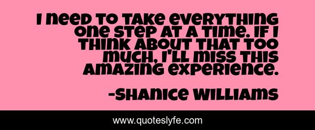 This page presents the quote "I need to take everything one step at a time. If I think about that too much, I'll miss this amazing experience.". Author of this quote is Shanice Williams. This quote is about step, experience, time,.