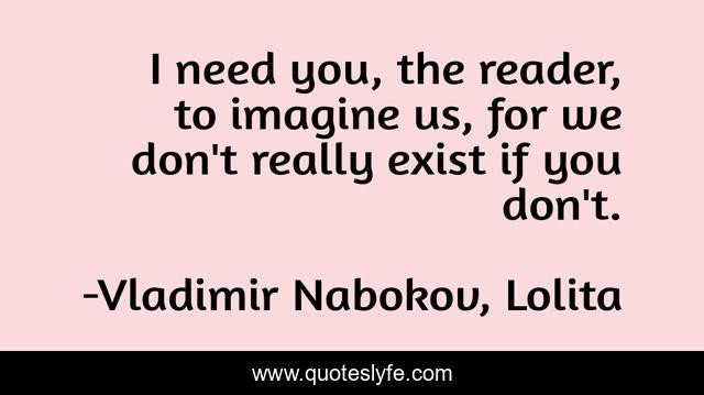 This page presents the quote "I need you, the reader, to imagine us, for we don't really exist if you don't.". Author of this quote is Vladimir Nabokov, Lolita. This quote is about need, imagine, exist, reader,.