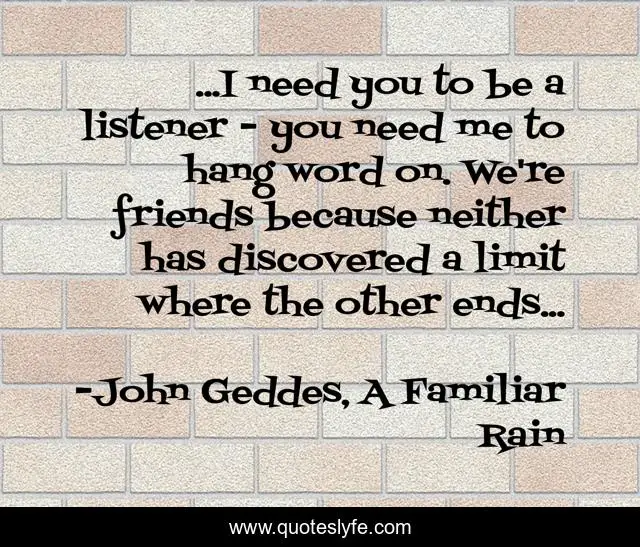 This page presents the quote "...I need you to be a listener - you need me to hang word on. We're friends because neither has discovered a limit where the other ends...". Author of this quote is John Geddes, A Familiar Rain. This quote is about listerner, needs, friends, words, no-limits,.