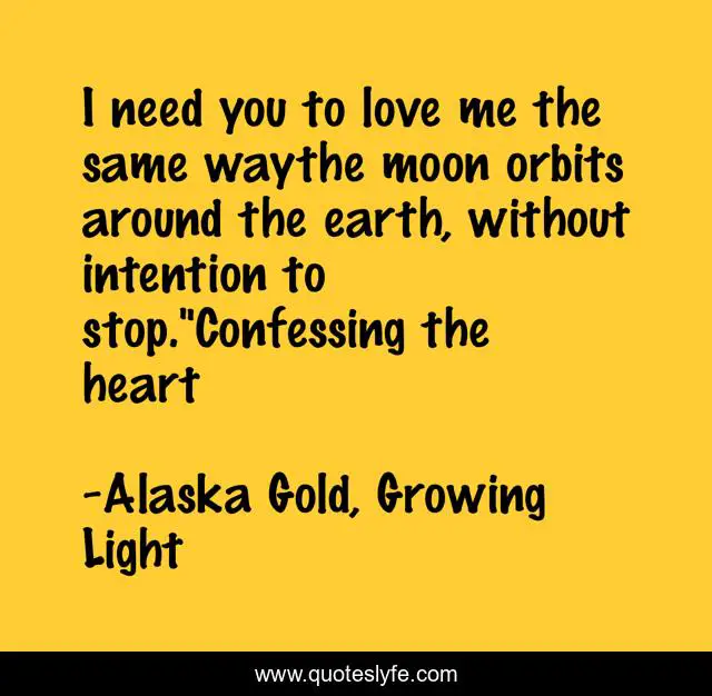 This page presents the quote "I need you to love me the same waythe moon orbits around the earth, without intention to stop."Confessing the heart". Author of this quote is Alaska Gold, Growing Light. This quote is about relationships, trust, love, sun, moon, alaska-gold, inspirational, enthusiasm, writing,.