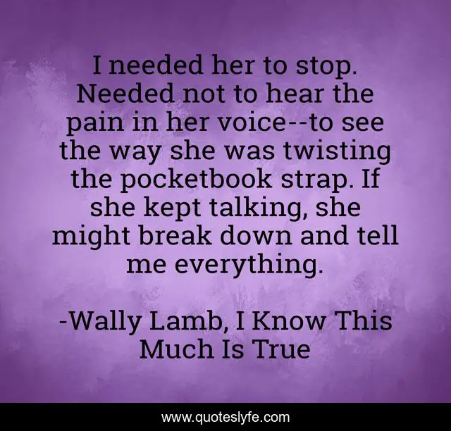 This page presents the quote "I needed her to stop. Needed not to hear the pain in her voice--to see the way she was twisting the pocketbook strap. If she kept talking, she might break down and tell me everything.". Author of this quote is Wally Lamb, I Know This Much Is True. This quote is about break-down, talking, pain, depression,.