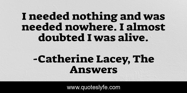 This page presents the quote "I needed nothing and was needed nowhere. I almost doubted I was alive.". Author of this quote is Catherine Lacey, The Answers. This quote is about closed-off, catherine-lacey, the-answers, isolated, dead, unreality, unwanted, unneeded,.