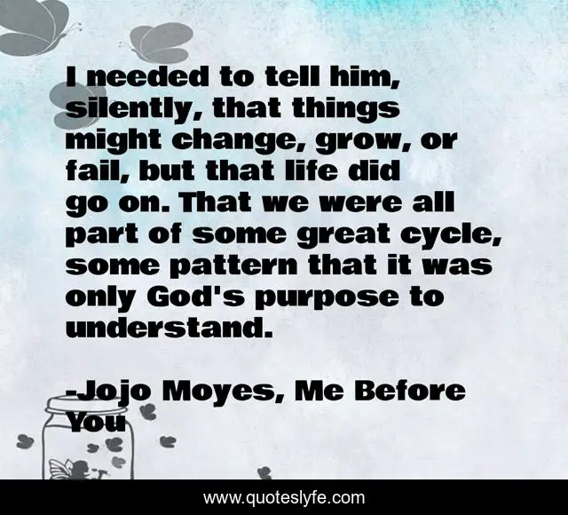 This page presents the quote "I needed to tell him, silently, that things might change, grow, or fail, but that life did go on. That we were all part of some great cycle, some pattern that it was only God's purpose to understand.". Author of this quote is Jojo Moyes, Me Before You. This quote is about life-and-death, change,.
