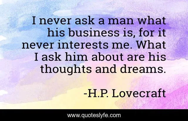 This page presents the quote "I never ask a man what his business is, for it never interests me. What I ask him about are his thoughts and dreams.". Author of this quote is H.P. Lovecraft. .