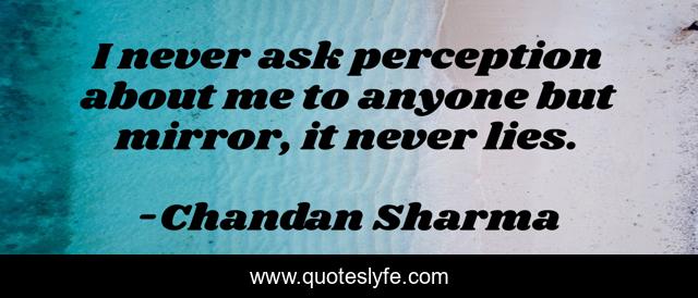 This page presents the quote "I never ask perception about me to anyone but mirror, it never lies.". Author of this quote is Chandan Sharma. This quote is about life, positive, motivational, confidence, optimistic, life-and-living,.