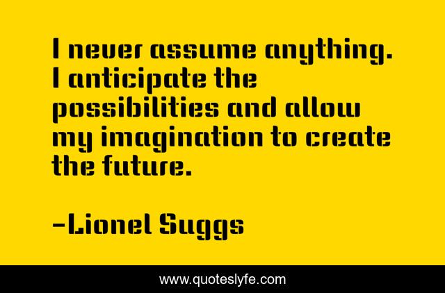 This page presents the quote "I never assume anything. I anticipate the possibilities and allow my imagination to create the future.". Author of this quote is Lionel Suggs. This quote is about anticipation, imagination, insight, prediction,.