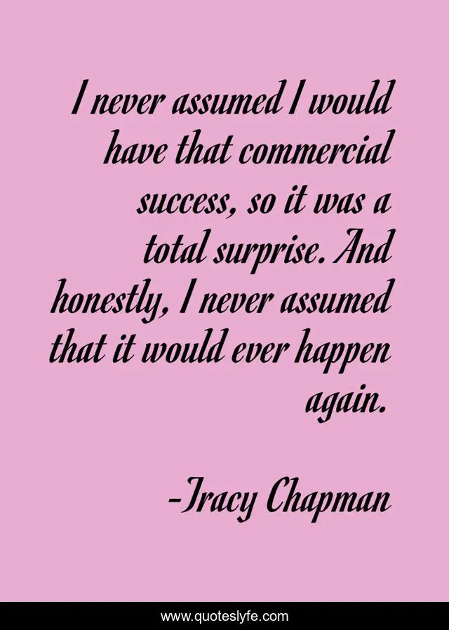 This page presents the quote "I never assumed I would have that commercial success, so it was a total surprise. And honestly, I never assumed that it would ever happen again.". Author of this quote is Tracy Chapman. This quote is about surprise, happen,.