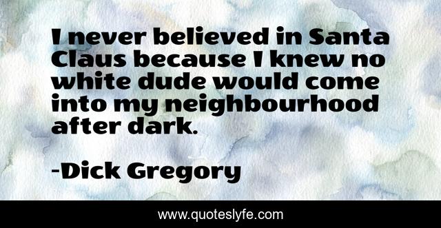 This page presents the quote "I never believed in Santa Claus because I knew no white dude would come into my neighbourhood after dark.". Author of this quote is Dick Gregory. This quote is about bigotry, prejudice,.