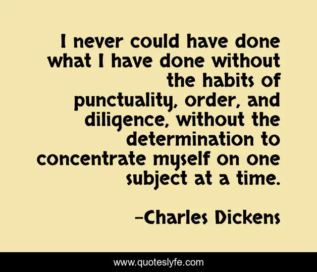 This page presents the quote "I never could have done what I have done without the habits of punctuality, order, and diligence, without the determination to concentrate myself on one subject at a time.". Author of this quote is Charles Dickens. This quote is about myself, determination,.