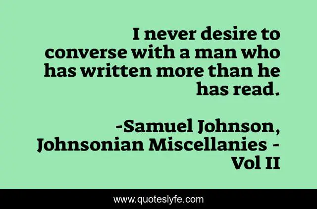 This page presents the quote "I never desire to converse with a man who has written more than he has read.". Author of this quote is Samuel Johnson, Johnsonian Miscellanies - Vol II. This quote is about conversation, books, erudition, reading, writing,.