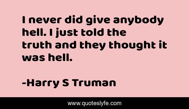 This page presents the quote "I never did give anybody hell. I just told the truth and they thought it was hell.". Author of this quote is Harry S Truman. This quote is about thought, hell,.