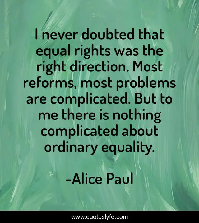 This page presents the quote "I never doubted that equal rights was the right direction. Most reforms, most problems are complicated. But to me there is nothing complicated about ordinary equality.". Author of this quote is Alice Paul. This quote is about me, direction, problems,.