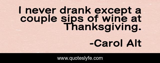 This page presents the quote "I never drank except a couple sips of wine at Thanksgiving.". Author of this quote is Carol Alt. This quote is about couple, wine,.