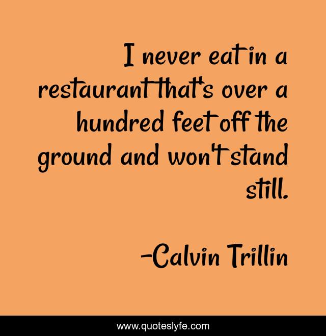 This page presents the quote "I never eat in a restaurant that's over a hundred feet off the ground and won't stand still.". Author of this quote is Calvin Trillin. This quote is about feet, stand, restaurant,.