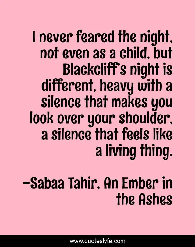 This page presents the quote "I never feared the night, not even as a child, but Blackcliff’s night is different, heavy with a silence that makes you look over your shoulder, a silence that feels like a living thing.". Author of this quote is Sabaa Tahir, An Ember in the Ashes. .