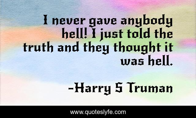 This page presents the quote "I never gave anybody hell! I just told the truth and they thought it was hell.". Author of this quote is Harry S Truman. This quote is about thought, hell,.