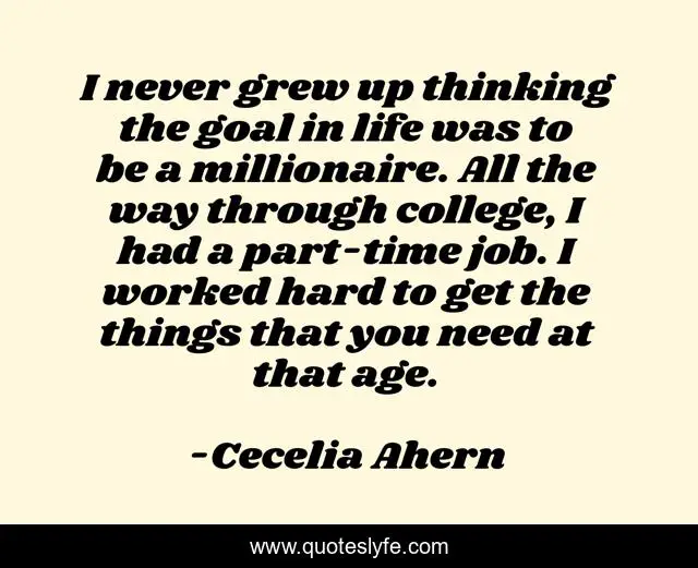 This page presents the quote "I never grew up thinking the goal in life was to be a millionaire. All the way through college, I had a part-time job. I worked hard to get the things that you need at that age.". Author of this quote is Cecelia Ahern. This quote is about life, college, job,.