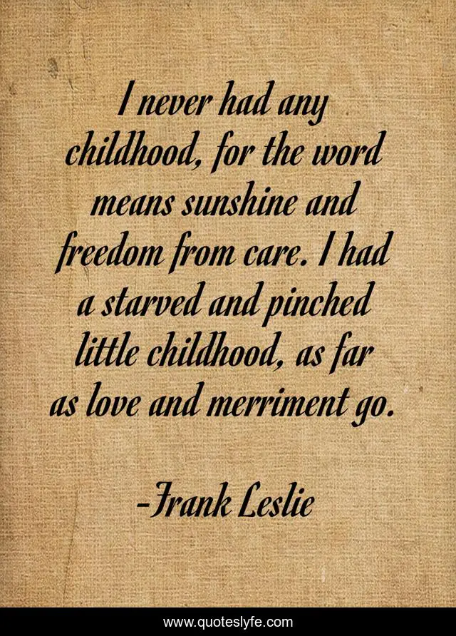 This page presents the quote "I never had any childhood, for the word means sunshine and freedom from care. I had a starved and pinched little childhood, as far as love and merriment go.". Author of this quote is Frank Leslie. This quote is about sunshine, love, childhood, affection,.