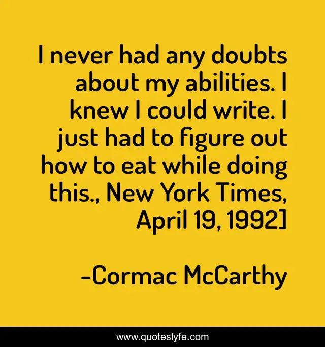 This page presents the quote "I never had any doubts about my abilities. I knew I could write. I just had to figure out how to eat while doing this., New York Times, April 19, 1992]". Author of this quote is Cormac McCarthy. This quote is about humor, ability, gift, author, earning-a-living, writing-life, writing, quotes, self-support,.