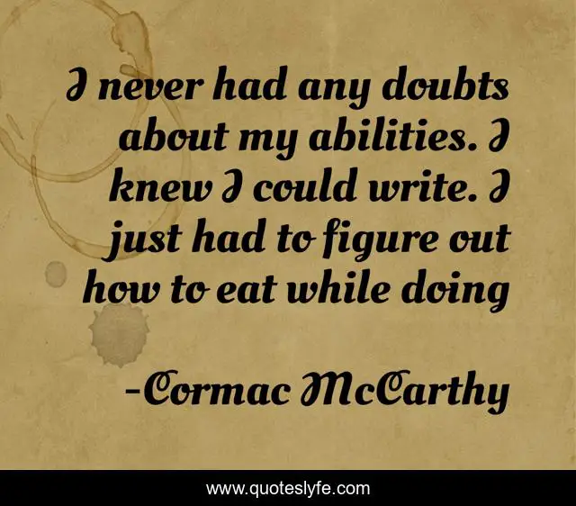 This page presents the quote "I never had any doubts about my abilities. I knew I could write. I just had to figure out how to eat while doing". Author of this quote is Cormac McCarthy. This quote is about humor, ability, gift, author, earning-a-living, writing-life, writing, quotes, self-support,.