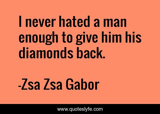 This page presents the quote "I never hated a man enough to give him his diamonds back.". Author of this quote is Zsa Zsa Gabor. This quote is about relationships, funny, men, humor, comedy,.