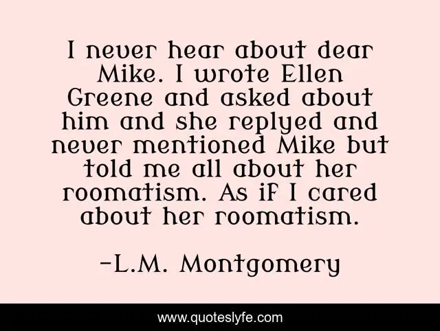 This page presents the quote "I never hear about dear Mike. I wrote Ellen Greene and asked about him and she replyed and never mentioned Mike but told me all about her roomatism. As if I cared about her roomatism.". Author of this quote is L.M. Montgomery. This quote is about funny, mike, comedy, emily-of-new-moon, cat,.