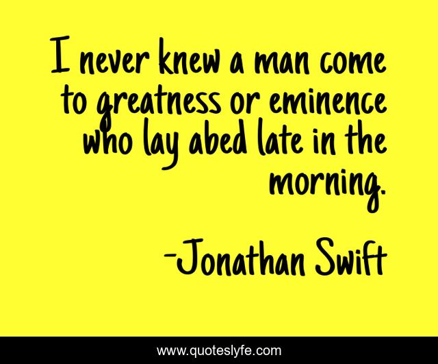 This page presents the quote "I never knew a man come to greatness or eminence who lay abed late in the morning.". Author of this quote is Jonathan Swift. This quote is about late, man, greatness,.