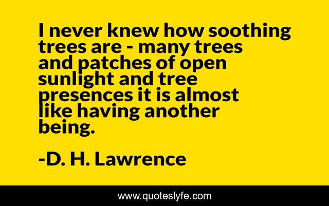 This page presents the quote "I never knew how soothing trees are - many trees and patches of open sunlight and tree presences it is almost like having another being.". Author of this quote is D. H. Lawrence. .