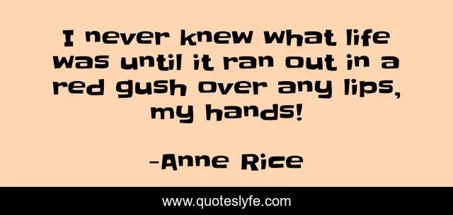 This page presents the quote "I never knew what life was until it ran out in a red gush over any lips, my hands!". Author of this quote is Anne Rice. .