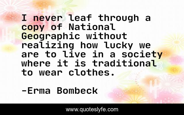 This page presents the quote "I never leaf through a copy of National Geographic without realizing how lucky we are to live in a society where it is traditional to wear clothes.". Author of this quote is Erma Bombeck. This quote is about live, leaf, clothes,.