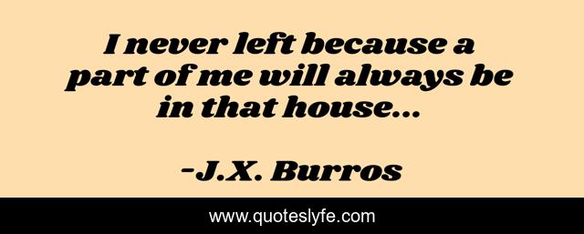 This page presents the quote "I never left because a part of me will always be in that house...". Author of this quote is J.X. Burros. This quote is about house, scarlet-spotlight, growing-up,.