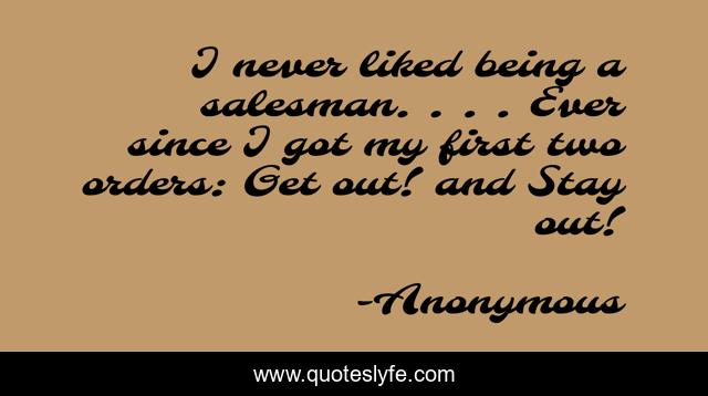 This page presents the quote "I never liked being a salesman. . . . Ever since I got my first two orders: Get out! and Stay out!". Author of this quote is Anonymous. This quote is about professions, work,.