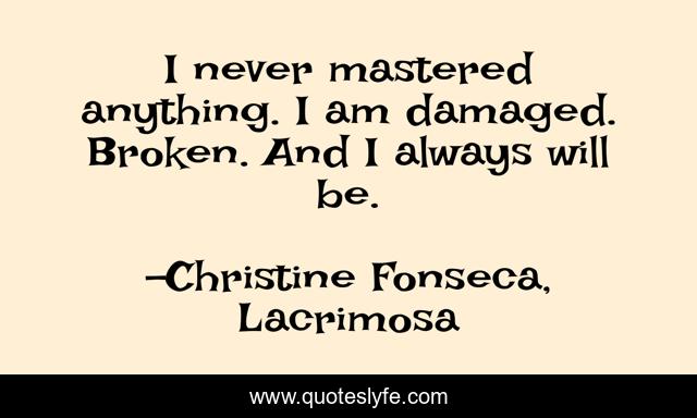 "Christine Fonseca, Lacrimosa Quotes." Quoteslyfe.com, 2025. Sat. 06 Dec. 2025. <https://www.quoteslyfe.com/quote/I-never-mastered-anything-I-am-damaged-188684>.